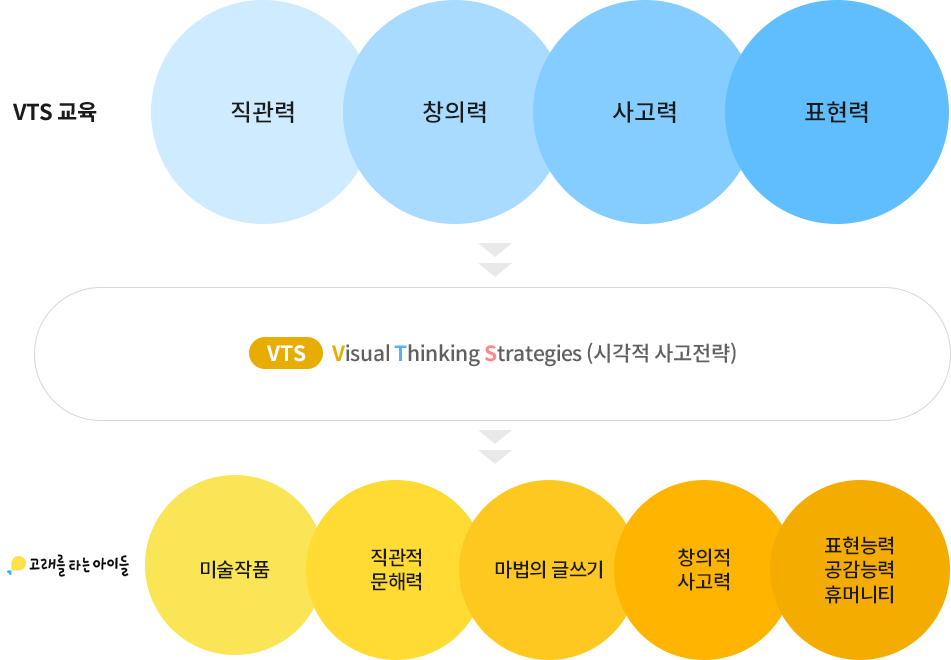 VTS는 미디어를 직관적으로 보고 창의적인 상상력을 통해 사고하고 표현하도록 하는 훈련 프로그램입니다
